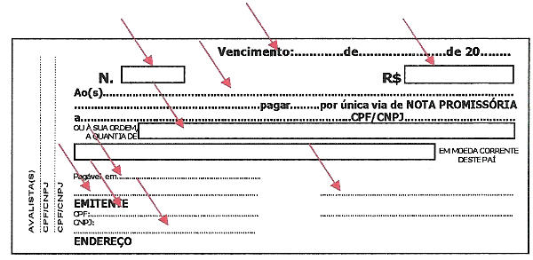 As setas vermelhas indicam onde se deve ter especial zelo no preenchimento dos dados nos títulos. Cuidando sempre para não informar dados incorretos, não rasurar ou borrar, tornando-os ilegíveis. Pois, todas as informações apresentadas serão inteiramente de responsabilidade do credor apresentante. Deverá indicar o CPF e o endereço do emitente.